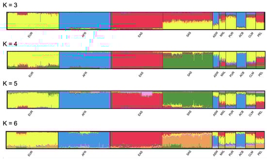 The results obtained with the STRUCTURE software corroborated the relationship between the different population groups and provided additional support for the reliability of the calculated genotypes. When k = 3, SAS resembled an admixture between EAS and EUR. A specific cluster for SAS emerged when k = 4. When k = 5, a minor Eurasian (shared between EUR and EAS) component arose. When k = 6, the SAS-shared ancestry with EUR and EAS became more evident. Regarding the admixed American populations, irrespective of the number of clusters considered, ACB and ASW revealed their preeminent African origin, CLM and PUR revealed more extensive European ancestry, and MXL and PEL revealed almost equal amounts of European and Amerindian (i.e., EAS) ancestries. These results fully corroborated the distribution of the populations into the PCoA (Figure 1). Additional clusters did not provide increased resolution with straightforward meaning.