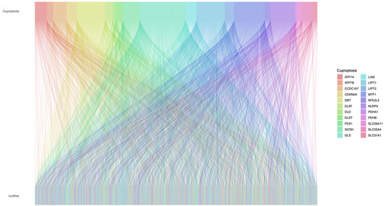 The relationships between cuproptosis-related genes and cuproptosis-related lncRNAs in the Sankey diagram. lncRNA, long noncoding RNA.