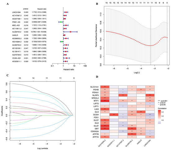 The “glmnet” package of R software was used to find the cuproptosis-related lncRNAs with the highest prognostic values. We identified sixteen lncRNAs (Figure 2A). Among them, 14 lncRNAs with a hazard ratio (HR) > 1, LINC01094, AC147067.2, AC037198.1, MSC−AS1, AC110611.2, AL359704.2, HAGLR, AC006033.2, AL590705.3, AC133106.1, AL139147.1, AL670729.3, VCAN−AS1, and AC023511.1 were found to be poor prognostic predictors, while the other two, PINK1−AS and AC016394.2, may be protective indicators. We then evaluated six lncRNAs using LASSO (least absolute shrinkage and selection operator) regression (Figure 2B,C). The correlation heatmap demonstrated the relationship between six tested lncRNAs and genes involved to cuproptosis (Figure 2D). Risk score = (−0.6558*AC016394.2 expression) + (0.4407*AC023511.1 expression) + (0.3219*AC147067.2 expression) + (0.7508*AL590705.3 expression) + (0.2162*HAGLR expression) + (0.8137*LINC01094 expression) was the formula used to create the risk score model.
