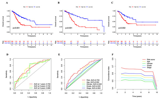 Validation of cuproptosis-associated lncRNA signature in STAD (A–C) Kaplan–Meier survival curves of overall survival of STAD patients in low- and high-risk groups in the entire, train, and test sets, respectively. (D) ROC curve of the cuproptosis-associated lncRNA signature in the entire set. ROC curve, receiver operating characteristics curve; AUC, area under the curve; p < 0.05, statistically significant. (E) ROC demonstrated the predictive accuracy of the risk model was superior to other clinical parameters. (F) The C-index curve showed the predictive accuracy of the risk model was superior to other clinical parameters. C-index curve, concordance-index curve.