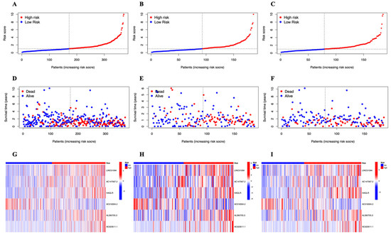 Prognosis of the risk model in different groups. (A–C) The distribution of overall survival risk scores in the entire, train, and test sets. (D–F) Survival time and survival status in the entire, train, and test sets. (G–I) Heat maps of six lncRNA expressions in the entire, train, and test sets.