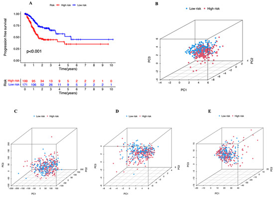 (A) Kaplan–Meier curves of progression-free survival (PFS) in STAD patients. (B–E) PCA in both groups of patients. (B) PCA of six risk lncRNAs in the prognostic marker. (C) PCA of all genes. (D) Twenty-two cuproptosis-related genes. (E) Sixteen cuproptosis-related lncRNAs. PCA, principal component analysis.