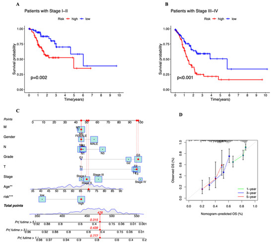 (A,B) Kaplan–Meier curves depicting subgroup survival analysis stratified by stage. p < 0.05, statistically significant. (C) The nomogram for risk score could predict the probability of survival based on the total points. (D) The calibration curves test the agreement between actual and predicted outcomes for STAD patients’ overall survival at 1-year (green line), 3-year (blue line), and 5-year (red line). ** p < 0.01, *** p < 0.001.
