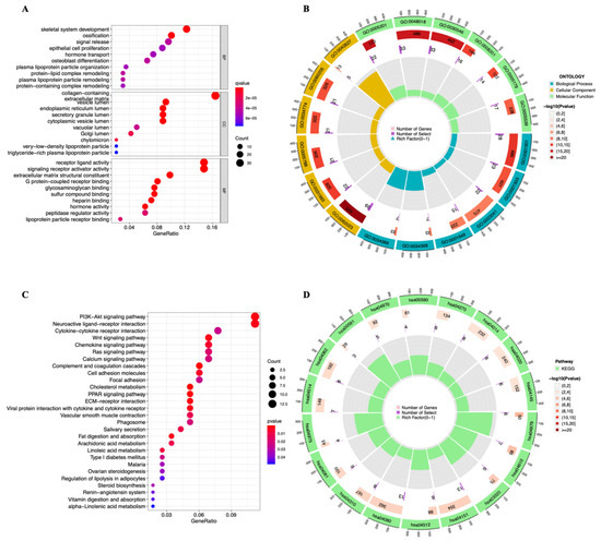 To learn more about the lncRNAs and mRNAs that were differentially expressed in the two risk groups, we used GO (Figure 8A,B) and KEGG (Figure 8C,D) pathway analysis. Skeletal system development and ossification were highly enriched in the BP (biological processes) category. The DEGs were primarily concentrated in collagen-containing as well as six other pathways within the CC (cellular components) category. DEGs were primarily enriched in receptor–ligand activity and signaling receptor activator activity in the MF (molecular functions) category. Differentially expressed genes were mainly enriched in the PI3K-Akt signaling network, neuroactive receptor–ligand interaction, and another 22 pathways, according to KEGG pathway analysis.