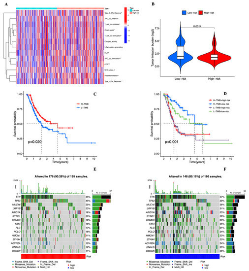 (A) The ssGSEA scores of immune cells and immune function in the high- and low-risk groups. “ssGSEA”, single sample gene set enrichment analysis. (B) The TMB in STAD patients between the high-risk and low-risk groups. TMB, tumor mutational burden; p < 0.05, statistically significant. (C) Higher TMB levels demonstrated poorer OS, p < 0.05, statistically significant. (D) Kaplan–Meier curves for patients by both risk score and TMB, p < 0.05, statistically significant. (E,F) Waterfall plots of somatic mutation characteristics in the high- and low-risk groups.