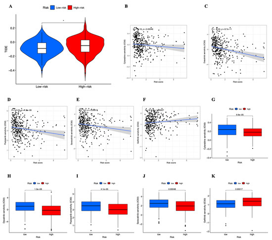 (A) TIDE scores between the high- and low-risk groups. (B–K) The role of risk score model in STAD treatment. The correlation between the risk score and estimated IC50 value of (B) Cytarabine, (C) Dasatinib, (D) Pazopanib, (E) Saracatinib and (F) Gefitinib. Comparison of estimated IC50 value of (G) Cytarabine, (H) Dasatinib, (I) Pazopanib, (J) Saracatinib and (K) Gefitinib between high- and low-risk groups.