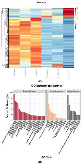 We finally obtained 96,327,758 and 84,994,242 raw reads and 95,245,446 and 83,904,532 valid reads from the vernalized and nonvernalized samples, respectively (Table S2). After filtering, the valid reads were mapped to the reference genome (RefBeet-1.1) of B. vulgaris. In total, 31,312 mRNAs were identified, among which 22,159 were differentially expressed in the vernalized samples and 9153 in the nonvernalized ones (Table S3, Figure 1A). The significantly expressed mRNAs was screened, among which 474 were upregulated (83.16%) and 96 were downregulated (16.84%) (Table S4, Figure 1B). The expression patterns of the differentially expressed mRNAs in each sample were exhibited by a heat map (Figure 1C). GO and KEGG enrichment analysis were also performed to explore the potential functions of these mRNAs.