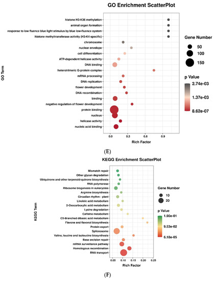 A total of 563 GO terms were screened by GO enrichment analysis (Table S5). The majority of the differentially expressed mRNAs were annotated to “regulation of transcription, DNA-binding”, “protein phosphorylation”, and “oxidation-reduction process” in the BP category, and to “nucleus”, “integral component of membrane”, and “membrance” in the CC category, while the GO terms were annotated to “protein binding”, and “ATP binding” in the MF category (Figure 1D). A total of 423 GO terms with significance (p-values ≤ 0.05) were obtained. These terms included the oxidation–reduction process, heme binding, extracellular region, apoplast, peroxidase activity, cell wall, response to oxidative stress, glucosinolate biosynthetic process, monolayer-surrounded lipid storage body, and response to light stimulus (Figure 1E) that may be involved in the vernalization pathway of sugar beet. KEGG enrichment analysis indicated that these differentially expressed mRNAs were assigned to 105 pathways, among which 6 metabolic pathways with significance (p ≤ 0.05) were included (Figure 1F) (Table S6). The pathways “RNA transport”, “Homologous recombination”, “mRNA surveillance pathway”, “Base excision repair”, “Valine, leucine and isoleucine biosynthesis”, and “Spliceosome” were significantly enriched in vernalized samples.