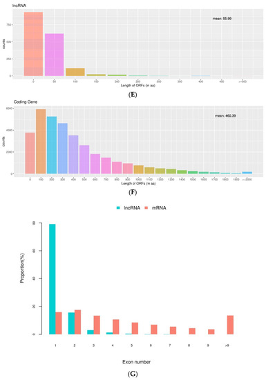 Identification and analysis of long-coding RNAs (lncRNAs) under vernalization. (A) The number of upregulated and downregulated differentially expressed lncRNAs identified between the vernalized and nonvernalized samples; (B) The number of significant differentially expressed lncRNAs between the vernalized and nonvernalized samples; (C) The volcano plot of differentially expressed lncRNAs; (D) Transcript length distribution of differentially expressed lncRNAs and mRNAs; (E,F) ORF length distribution of differentially expressed lncRNAs and mRNAs; (G) The exon number of differentially expressed lncRNAs and mRNAs; (H) Gene Ontology (GO) classifications; and (I) Kyoto Encyclopedia of Genes and Genome (KEGG) pathway assignments for all differentially expressed lncRNAs.