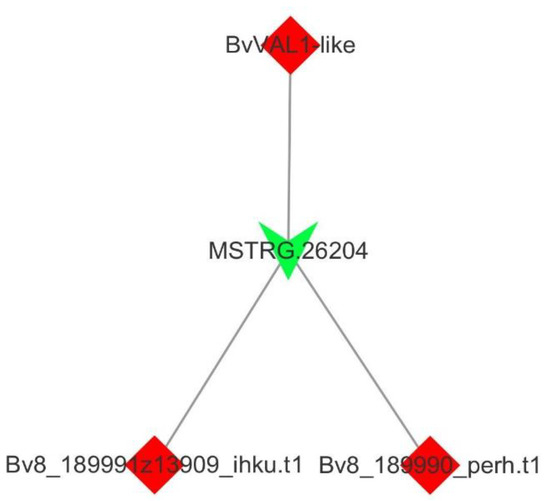 The expression patterns of long noncoding RNA (MSTRG.26204) and mRNAs (Bv8_189980_mizi.t1: BvVAL-like, Bv8_189990_perh.t1 and Bv8_189991z13909_ihku.t1) (Table S1) in the co-expression network of sugar beet.