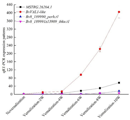 The differentially expressed gene Bv8_189980_mizi.t1 encoded a B3 domain-containing transcription repressor VAL1-like, while the Bv8_189990_perh.t1 gene has not been characterized. Additionally, 34 genes encoding B3 domain-containing proteins were identified in our results, among which 26 were upregulated by vernalization such as B3 domain-containing proteins VRN1, VRN1-like, VAL1 and VAL2. Those genes were considered as the vernalization genes in wheat and A. thaliana. We also identified the FT-interacting protein 1, which was downregulated by cold treatment. Furthermore, we analyzed the expression patterns of these genes at different time points (i.e., vernalization at 0, 2, 4, 6, 8 and 10 weeks) (Figure 7). Our results indicated that the expression patterns obviously reached their highest levels at a time point of 10 weeks in vernalization. Moreover, the differentially expressed BvVAL1-like, BvVRN1, BvVRN1-like, BvVAL1 and BvVAL2 genes all contained the B3 domains, indicating that they were perhaps the vernalization genes of sugar beet. In addition, MSTRG.26204.1, cis-regulating the BvVAL1-like expression, was the long noncoding RNA association with vernalization of sugar beet.