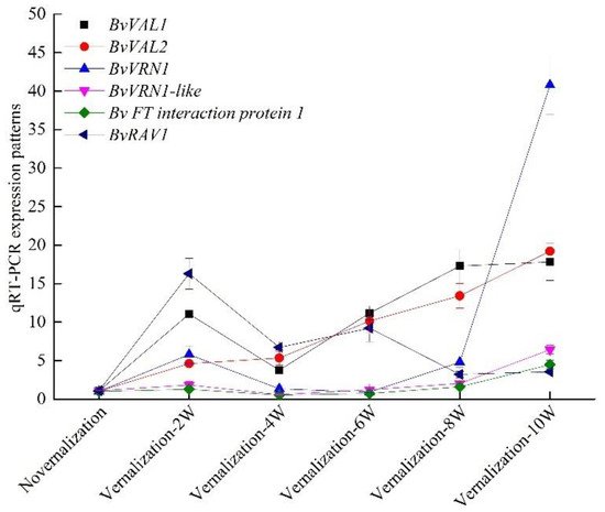 The expression patterns of BvVRN1-like (Bv5_119850_xzuy.t1), BvVRN1 (Bv6_136060_dknq.t1), BvRAV1 (Bv6_140480_qrgc.t1), BvVAL1 (Bv7_179010_ycqe.t1), BvVAL2 (Bv7_156080_dced.t1) and BvFT-interacting protein 1 (Bv4_072340_puin.t1) (Table S1).