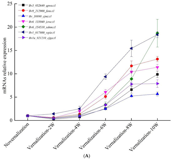 Quantitative real-time polymerase chain reaction (qRT-PCR) analysis at time point (i.e., vernalization at 0, 2, 4, 6, 8 and 10 weeks). The qRT-PCR results for (A) differentially expressed mRNAs; (B) differentially expressed long-coding RNAs. BvICDH was used as the internal control. Error bars, mean ± s.e. (n = 3).