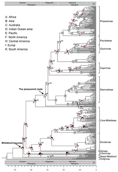 In order to infer the possible ancestral ranges of the Millettiod legumes, a Bayes-DIVA analysis [38] was conducted using the software package RASP [39]. Bayes-DIVA method is a popular method with the advantages of minimizing the phylogenetic uncertainties and generating credibility support values for alternative phylogenetic relationships [38,39]. We used 1000 trees from the BEAST output as a “trees file”. The maximum clade credibility tree was used as a final representative tree. With the aim of predicating the ancestral areas of nodes deeper down into the tree, biogeographical analyses were run on continental spatial scale at species level. According to Lewies et al. [9] and the ILDIS database, nine geographic regions were coded: A, Africa; B, Asia; C, Australia; D, Indian Ocean area, including islands in the Indian Ocean region and Madagascar; E, Pacific, including islands in the Pacific; F, North America; H, Central America; I, Europe; K, South America (Table S1). The “maxareas” was constrained to 3 when constructing the ancestral areas of the Millettiod legumes.