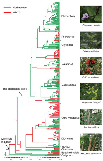 Habit shift analysis of the Millettiod legumes. Green represents herbaceous; red represents woody. Images are representative species from the Millettiod legumes.