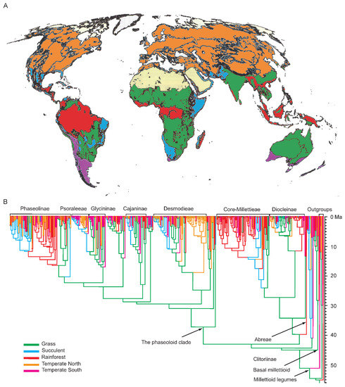 - Li, H.; Wang, W.; Lin, L.; Zhu, X.; Li, J.; Zhu, X.; Chen, Z. Diversification of the phaseoloid legumes: Effects of climate change, range expansion and habit shift. Front. Plant Sci. 2013, 4, 386. [Google Scholar] [CrossRef]