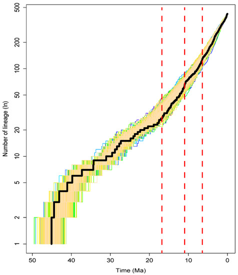 Our biogeographic reconstruction and dating analyses indicated the Millettiod legumes occurred in Africa (p = 0.44) or Asia (p = 0.39) in the early Eocene. The LTT plot indicated that a dramatic burst of diversification of the Millettiod legumes occurred during the Miocene (c. 18–8 Ma; Figure 4). Three dramatic accumulations of the Millettiod legumes were detected at 17.8 Ma, 11.6 Ma and 8.5 Ma (Table 1). In accordance with the diversification patterns, high frequent migrations of the Millettiod legumes did not occur until the Miocene after its origin with the exception of some dispersal events into Central America and South America (clade Clitoriinae). Multiple colonization events seem to have occurred within a 10-million-year time window (c. 18–8 Ma, Figure 1). The ancestor of the Diocleinae experienced dispersal events into Central America, South America and the Pacific. There were at least three dispersal events into Central America and South America for the core Millettieae, and two such movements into the Indian Ocean area (Figure 1 and Figure S4). Additionally, the Phaseoloids clade experienced multiple dispersal events from Africa to Central America. In the Miocene, the Qinghai–Tibetan Plateau experienced multiple stages of uplift with a rapid uplift at 10–7 Ma [40,41,42,43,44]. The African plate collided with the Eurasian at ca. 18–17 Ma [45]. In the southern hemisphere, the thrust of the South American plate against the Pacific plate led to the rise of the Andes mountains [46]. These geological events fragmented the ecosystems and subsequently opened many new niches [47,48], and forced the rapid diversification of many plant lineages [16,49,50,51,52,53]. Thus, our finding suggests that the rapid diversification of the Millettiod legumes in the Miocene was driven by ecological opportunities created by the emergence of new niches and range expansion.