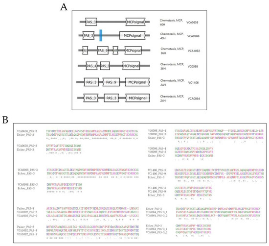 In silico analysis of the six MCPs with PAS domain in V. cholerae C6706 genome. (A) Predicted domain structure and type using MiTS 3.0. (B) Amino acid sequence alignment of aer homologs using MUSCLE. Residue conservation between groups are labeled with asterisk (*), colon (:), and dot(.) from high to low similarity.