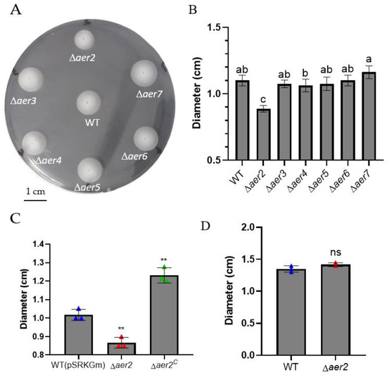 The swarming ability of these mutants was further determined using the swarming motility assay. The diameter of the swarm ring was measured after 24 h incubation. Only the ∆aer2 mutant displayed a significant defect when compared to the wild type (Figure 2A,B), indicating that the motility disadvantage of the ∆aer2 mutant is limited in the swarming behavior. We then constructed a complementary strain by introducing the recombinant plasmid pSRK-aer2 into the ∆aer2 mutant strain (hereafter named ∆aer2C). Figure 2C showed that the overexpression of aer2 not only restores the swarming motility, but even enhances aerotaxis compared with the phenotype of wild type carrying the empty vector plasmid (Figure 2C). These findings are consistent with those in V. cholerae classic biotype O395 and E. coli K12 [23,30], indicating that aer2 is essential for bacterial swarming motility.