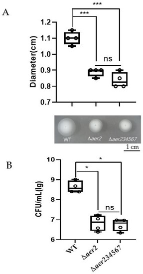 Swarming motility assay. The migration ability of WT, Δaer2, and Δaer234567 mutants using a soft-agar plate after 24 h incubation at 30 °C (A), or by calculating CFU on the medium-air contact surface of the Pasteur pipette in the air trap assay (B). *, p < 0.05; ***, p < 0.001; ns, no significance (Student t-test).