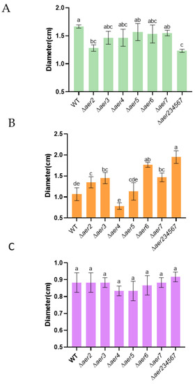 Chemotaxis assay of the mutant and wild-type strains. Chemotaxis behavior was observed on soft-agar plates with 200 mg/mL mucin (A), 0.5% bile salts (B), and 200 mM KCl (C) as attractants. Bacterial cultures were incubated for 24 h at 30 °C. Different letters in a single column indicate significant differences between treatments (One-way ANOVA; p < 0.05).
