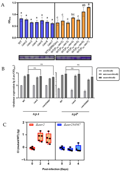 Next, we investigated whether these aer genes play any role in the pathogenesis of C6706. Although the earlier results suggested that aer2 plays a critical role in the aerotaxis of C6706 independent of the other five aer genes, we cannot exclude that these aer genes may cross-talk when the virulence genes are activated. First, we detected the influence of the aer genes on the expression of tcpP and tcpA [37], the main virulence factors of V. cholerae, in the induced AKI medium. Wild-type, ∆aer2, and ∆aer234567 mutants harboring various virulence gene reporter plasmids [38] were grown under the aerobic (shaking), microaerobic (standing), and anaerobic (chamber, standing) conditions (Figure 5B). Consistent with a previous report [38], the expression of the virulence genes was dependent on the oxygen concentration, while strains with mutations in the aer homologs demonstrated similar expression levels as wild type under similar conditions. These observations suggested that these aer genes have a negligible effect on virulence gene expression under stable oxygen concentrations.