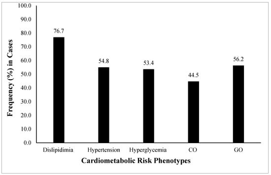 All study variables were compared (Mean ± SD) among healthy controls and cases (combined). The anthropometric parameters (age, weight, HC, SBP and DBP), adiposity indices (BMI, WC, WHR, VAI, BAI), and clinical test values (FBG, TG, TC, LDL) in all the case groups were in risk ranges and significantly higher (p < 0.05) compared with the healthy controls. Whereas HDL levels were significantly lower (p < 0.05) in the case groups as compared with controls (Table 1). The frequency distribution (%) of individual cardiometabolic risk phenotypes (dyslipidemia, hypertension, hyperglycemia, CO, GO) was also calculated in all cases. The highest frequency was dyslipidemia (76.7%) followed by GO (56.2%), hypertension (54.8 (53.4%), and CO (44.5%) (Figure 1).