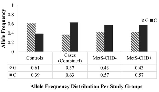 The minor allele frequency (MAF) distribution of rs1333049 between the case and control groups was compared to explore the genetic susceptibility of the variant toward disease in a Pakistani population. The frequency of the minor and risk C allele of the rs1333049 variant was higher in individuals from the case groups (combined MAF = 0.63, MetS-CHD− and MetS-CHD+ MAF = 0.57, respectively) as compared with the control group (MAF = 0.39, p-value < 0.0001). Compared with the controls, the significantly high frequency of minor C allele in the cases clearly indicated it was a risk allele (Figure 2).