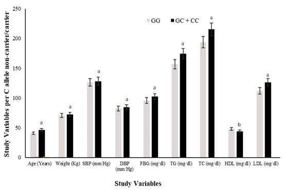 Comparison of study variables in rs1333049 SNP minor/risk (C) allele and major (G) allele carriers. Comparison of the levels of all study variables among G allele carrier (GG homozygotes) and C allele carrier (GC heterozygotes and CC homozygotes combined) study subjects. The levels of all study variables were raised in C allele carriers while HDL was lower compared with that of G allele carriers. The superscript “a” on bars for variables shows significantly higher levels in C allele carriers versus G allele carriers. Whereas superscript “b” on bars shows significantly lower levels in C allele carriers vs. G allele carriers.