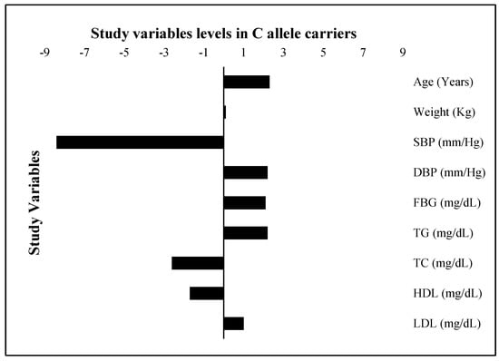 Study variable levels (SD change from population means) in C allele carriers. The levels of all study variables are presented as a standard deviation (SD) change from the population means in C allele carrier (GC heterozygotes and CC homozygotes combined) study subjects. The bars with +ive (>0) values represent higher/raised levels while those with −ive (<0) values show lower levels of individual variables in C allele carriers as compared with the G allele carriers.