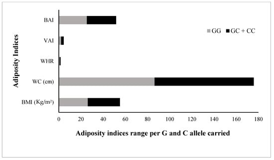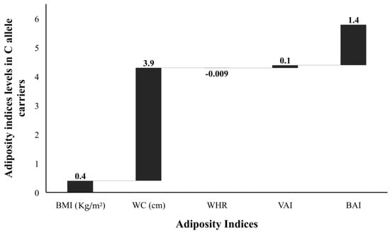 The FBG, TG, and LDL levels were raised by 2.1 mg/dL, 2.3 mg/dL, and 1.0 mg/dL, respectively; while the TC and HDL were 2.6 mg/dL and 1.7 mg/dL lower, respectively, in risk allele carriers as compared with non-carriers (Figure 4). The combined datasets of Figure 3 and Figure 4 have been included as a supplementary file (Table S1). Additionally, the adiposity indices BMI, WC, WHR, VAI, and BAI were all raised in the C allele carriers as compared with the G allele carriers (Figure 5). Per SD change, BMI was 0.4 Kg/m2, WC 3.9 cm, and VAI 0.1 and BAI 1.4 raised while WHR was 0.009 lower in C allele carriers (Figure 6). The combined datasets of Figure 5 and Figure 6 have been included as a supplementary file (Table S2).