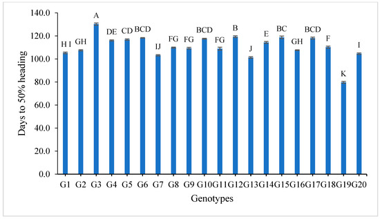 Mean values of days to 50% heading of twenty rice genotypes over the two years. Bar represents the standard deviation. Different alphabetic letters represent the significant differences among the genotypes at p < 0.05, based on Duncan’s multiple range test.