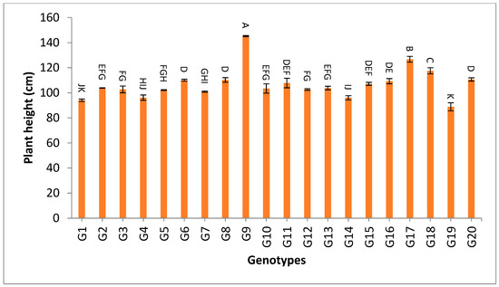 The mean values of plant height (cm) of twenty rice genotypes over the two years. Bar represents the standard deviation. Different alphabetic letters represent the significant differences among the genotypes at p < 0.05, based on Duncan’s multiple range test.