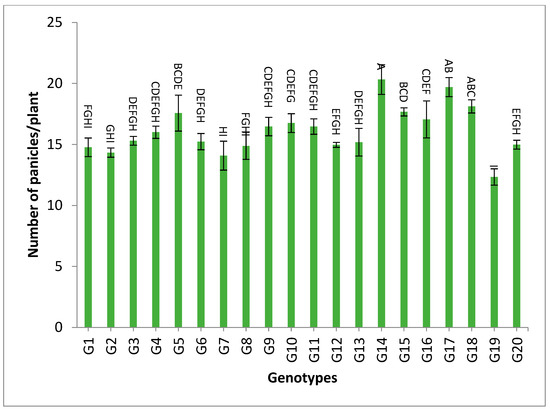 On the contrary, the genotypes G14, G17 and G18 recorded the highest numbers of panicles/plant for both years and the combination of the two years, as shown in Table S2 and Figure 3.
