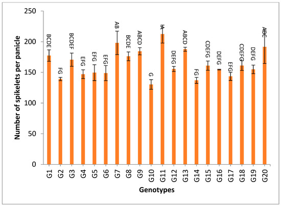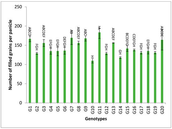 However, the genotypes G1, G2, G4, G6, G17, G9 and G3 recorded the highest values of pollen fertility % and spikelet fertility %, as shown in Tables S3 and S4. The data of the combined analysis over the two years demonstrated that the genotypes G11, G7, G20 and G9 gave the highest numbers of spikelets/panicle and numbers of filled grains/panicle, as shown in Table S4 and Figure 5 and Figure 6.
