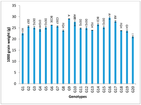 Mean values of 1000 grain weight (g) of twenty rice genotypes over the two years. Bar represents the standard deviation. Different alphabetic letters represent the significant differences among the genotypes at p < 0.05, based on Duncan’s multiple range test.