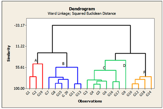 A scale of Euclidean distance and a minimal variance wing method, as defined by Ward (1963) [42], were used to perform a hierarchical cluster analysis on the standardized data.