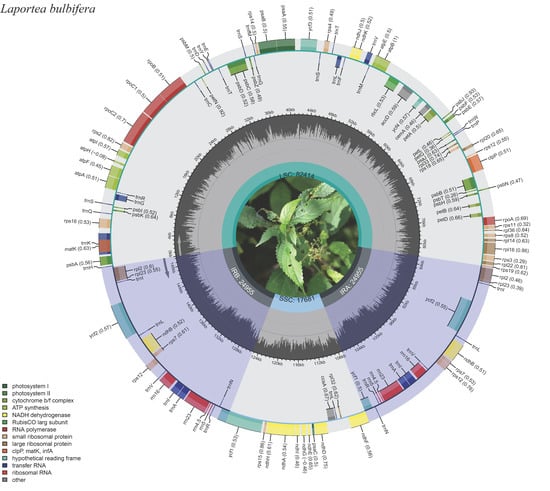 - Sun, K.; Sun, Q.; Xu, W.; Chen, C.; Wang, B.; Wang, Y. The complete chloroplast genome of Laportea bulbifera (Sieb. et Zucc.) Wedd. and its phylogenetic analysis. Mitochondrial DNA Part B 2022, 7, 658–660. [Google Scholar] [CrossRef]