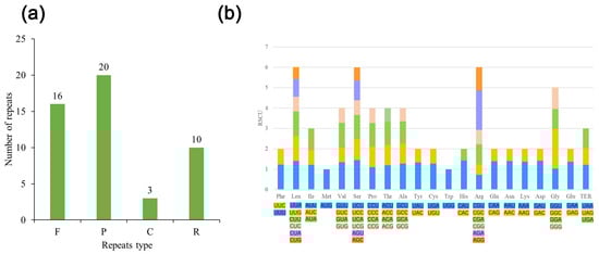 (a) Interspersed repeats in L. bulbifera, classified by type and frequency (F = forward, P = palindromic, R = reverse and C = complement). (b) The 20 amino acids and stop codon of coding genes of the L. bulbifera chloroplast genome. The color of the histogram corresponds to the color of codons.