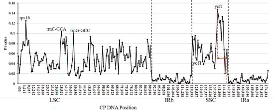 To better comprehend the genetic diversity, sliding window analysis with the DnaSP programs identified highly variable regions in the Laportea cp genome. Figure 3 has elaborated that hotspots of nucleotide divergence four hypervariable regions with Pi values over 0.10, including rps16 (Pi = 0.12494), trnC-GCA (Pi = 0.10289), trnG-GCC (Pi = 0.10067) and ycf1 (Pi = 0.12083~0.14722). Noteworthily, the Pi values of the genome in other regions are all greater than 0.02, except for the IR region, demonstrating the Laportea cp genome has abundant polymorphisms.