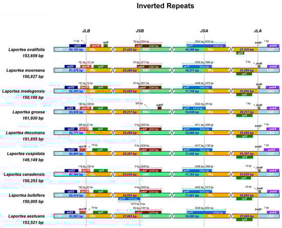 Here, we first sequenced, assembled, annotated, and processed data for chloroplasts of L. bulbifera. Then, the complete plastid data of eight Laportea species were downloaded from NCBI and aligned and concatenated using the MAFFT online website. Subsequently, the genetic differences, high variance regions, and evolutionary history of Laportea were analyzed using bioinformatics tools such as mVISTA and IRscope online sites, MEGA, and DnaSP software. The result indicated that the plastomes of Laportea, with sizes ranging from 149,149 bp to 161,930 bp, exhibited the tetrad structure typical of angiosperms. The cp genome had an uneven distribution of GC content, with IR regions having a higher abundance than LSC and SSC. The possible reason for this phenomenon is that the IR region is enriched with ribosomal RNA (rRNA) genes and transfer RNA (tRNA) genes of GC. At the same time, the conservatism in IR regions compared to SC regions may also be due to GC inequality [57,58]. In addition, previous studies have demonstrated that changes in IR/SC junctions are thought to be one of the main drivers of the size diversity of cp genomes in higher plants [59,60]. Changes in the length of the cp genome may be mostly caused by the shrinkage and extension of IR border regions [48]. Genes located on the border could make IR or SC sections with the extension or shrinkage of the IR boundary regions. (e.g., rps19, ycf1, and trnH shown in Figure 4). The result is consistent with previous findings, both indicating that the cp genomes of species within the same family or genus are extremely homogeneous [17].