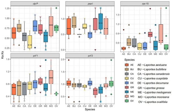 The dN/dS values between each plastid gene in the Laportea species are shown as box plots.