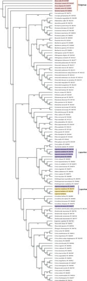 - Dong, W.; Liu, J.; Yu, J.; Wang, L.; Zhou, S. Highly variable chloroplast markers for evaluating plant phylogeny at low taxonomic levels and for DNA barcoding. PLoS ONE 2012, 7, e35071. [Google Scholar] [CrossRef]