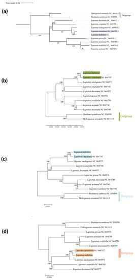 The phylogenetic tree of species from Laportea is based on 78 CDSs. (a) Phylogenetic tree constructed using the maximum likelihood (ML) methods. (b) Phylogenetic tree constructed using the unweighted pair group method with arithmetic mean (UPGMA) methods. (c) Phylogenetic tree constructed using the minimum evolution (ME) methods. (d) Phylogenetic tree constructed using the neighbor-joining (NJ) methods.