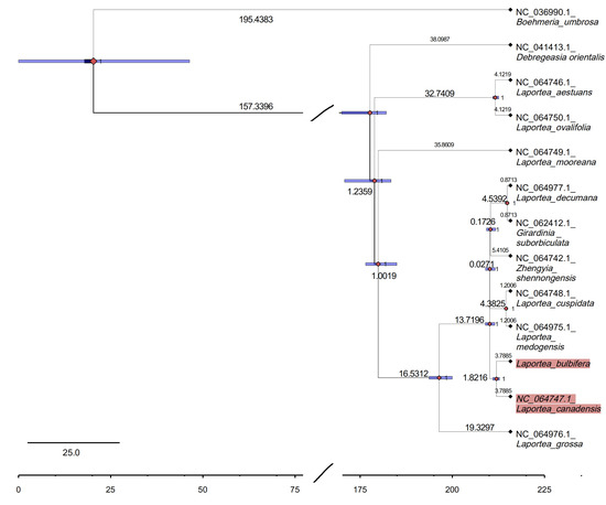 Four phylogenetic trees (ML, UPGMA, ME, and NJ) of Urticaceae were constructed based on the 115 CDSs. This result showed that the tree has higher support values on the whole, and the taxonomy of species in the genus Laportea is confusing, most of them were found scattered in Urera, Poikilospermum, Girardina, and Naporea. Specifically, it was clustered into four to five branches. Among these, both the ML tree and ME tree showed that L. bubifera, L. canandensis, and L. medogensis clustered into one branch, L. moreana, L. ovalifolia, L. aistuans, and L. grossa clustered into one branch. And L. decumana and L. cuspidata clustered as one, respectively, while NJ and UPGMA showed L. grossa as a separate species (Figure 6 and Figure S4). The results of the construction of species of Urticaceae in this study are generally consistent with previous studies [10,17]. Subsequently, to explore the affinities within the Laportea, we constructed four phylogenetic trees. The result showed that all nodes had the highest bootstrap support, and Laportea could be grouped into two clades, one clade includes four species (L. grossa, L. mooreana, L. ovalifolia, and L. aestuans), whereas the other clades include the remaining species. Phylogenetic tree analysis at the family and genus level indicated that L. bulbifera was closely related to L.canadensis (Figure 7). Furthermore, the divergence time of each internal node of the phylogenetic tree was estimated with fossil record data of Zhengyia shennongensis and Girardinia suborbiculata to calibrated by using BEAST for further infer the historical origin of Laportea species. It was shown that Laportea genus diverged at about ~157.3396 million years ago (Mya), with L. bulbifera splitting at~1.8216 Mya (Figure 8). The detected divergence time may contribute to future research on the Laportea genus.