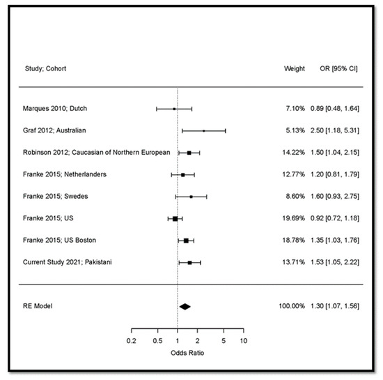 We performed a meta-analysis with a restricted maximum-likelihood estimator in the random-effects model on 13,915 subjects (7005 RA cases and 6907 controls) from five studies including our sample (Figure 2). The model showed an I2 value of 44.2%, indicating sufficient homogeneity of the studies included in the meta-analysis. The meta-analysis confirmed the association of FCGR3B CNV < 2 and increased risk of RA (OR = 1.30; 95% CI: 1.07 to 1.56; p = 0.00671).