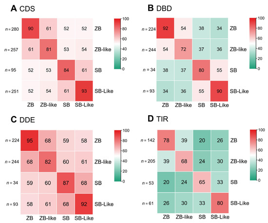 Sequence identities between ZB and SB elements among species. Sequence identities were measured by pairwise comparison of representative sequences of SB and ZB elements. The numbers in the heatmap are the percentage of the average values of the sequences’ identities of the two types of transposons in the corresponding row and column, and “n” represents the number of each type of transposon sequence (A–D). The average values of sequence identities were measured by pairwise comparison of representative sequences of CDS (A), DBD (B), DDE (C), and TIR (D) of ZB and SB elements.