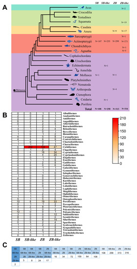 Taxonomic distribution of SB and ZB elements. (A) Taxonomic distribution of SB and ZB elements in the Metazoa, including cluster SB, cluster SB-like, cluster ZB, and cluster ZB-like. The numbers following the animal panels represent the number of species for which the corresponding transposon was detected in that lineage. (B) Taxonomic distribution of SB and ZB elements in the Actinopterygii. This graph was drawn based on statistics (Supplementary Table S3). The numbers in the table represent the distribution of SB and ZB species in this order. The darker the color, the more species containing the corresponding transposon in that order. (C) Overlapping species of SB and ZB. The numbers in the figure represent the number of species that possess several types of transposons in this column.