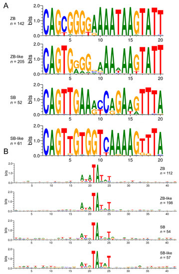 Compared with other Tc1/mariner families, such as maT/DD39D, GT/DD37D, and IC/DD36E [12,13], most TIRs of SB and ZB elements (94% of the total detected intact transposons, 330/350) are relatively long, ranging from 180 bp to 300 bp. However, very long and short TIRs are also observed in some species (Table 1 and Supplementary Table S1). The 3′ TIR of SB partially overlaps with the ORF regions, which is not observed for the other three group transposons (Figure 4C). The end motifs (20 bp) of TIRs are highly conserved across ZB, ZB-like, SB, and SB-like, and start with a GC-rich motif followed by an AT-rich region (Figure 5A). The genomic flank sequence analysis revealed that the integration profiles of ZB, ZB-like, SB, and SB-like in genomes are highly conserved, and display strongly preferential integration into AT repeats (Figure 5B).