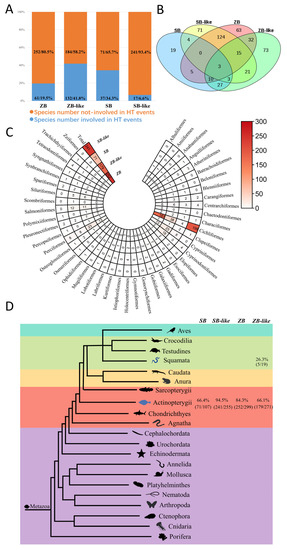 The HT events of ZB and SB transposons were recognized based on the standards described in methods and summarized in Supplementary Figure S3. The number of species involved in HT events was illustrated in Figure 6, indicating that HT obtained most ZB and SB transposons in animals. Overall, 252 (80.5% of the total detected species) ZB, 184 (58.2% of the total detected species) ZB-like, 71 (65.7% of the total detected species) SB, and 241 (93.4% of the total detected species) SB-like invaded species were involved in HT events (Figure 6A). Moreover, most HT events were confirmed in Actinopterygii at which the recorded species involved in HT events were SB: 64.4%, ZB: 84.3%, ZB-like: 66.1%, of which the highest occurred in SB-like: 94.5%. Notaby, most were detected in Cichliformes and Perciformes (Figure 6C,D). However, some HT events were observed in Squamata, where 26.3% (5/19) ZB-like invaded species are involved in HT events (Figure 6D). In addition, 16 species of Actinopterygii tend to be more common for HTs of these transposons and have been invaded by at least three families. Particularly, co-HT events of the four families (ZB, ZB-like, SB, and SB-like) were detected for three species (Siniperca knerii, Siniperca scherzeri, and Mastacembelus armatus) and represent the most common species of HTs (Figure 6B).